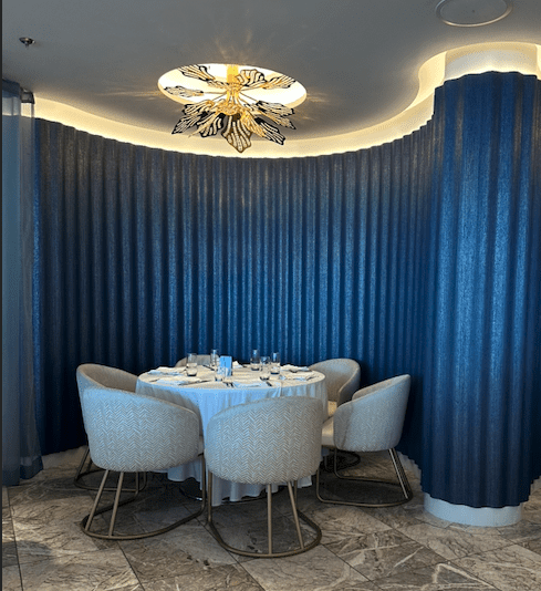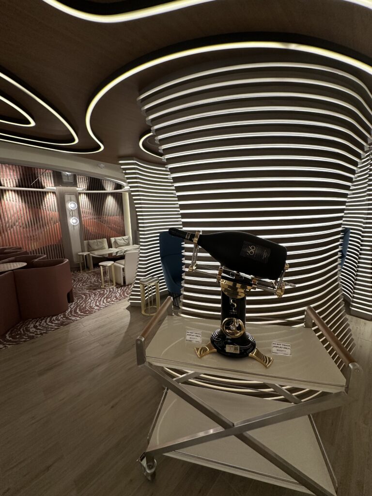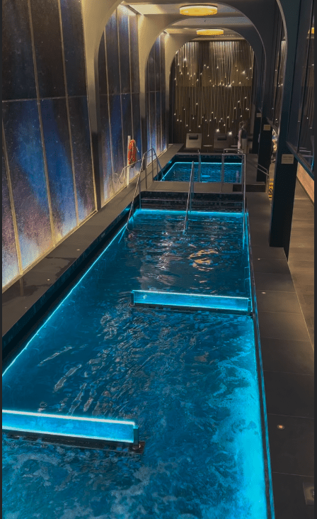 When I stepped into Mandara Spa on Norwegian Aqua, it honestly didn’t feel like I was on a cruise ship anymore—it felt like a sleek, boutique wellness retreat at sea. The thermal suite pools you see in my photos are part of an expansive spa area where you can move from warm, bubbling water to soothing loungers and simply let the motion of the ocean do the rest. A few decks away, Aqua Theater takes all that relaxation and flips the script; standing there, looking up at the dramatic lighting and massive screen, I could immediately picture my clients dressed up for a big night out, drinks in hand, ready for a show that feels far bigger than what you’d expect on a ship. And then there’s Swirl Wine Bar—tucked‑away, intimate, and beautifully lit—where I imagined my couples and friend groups ending the night with a glass of something special, talking about their day while soft music and conversation fill the space.