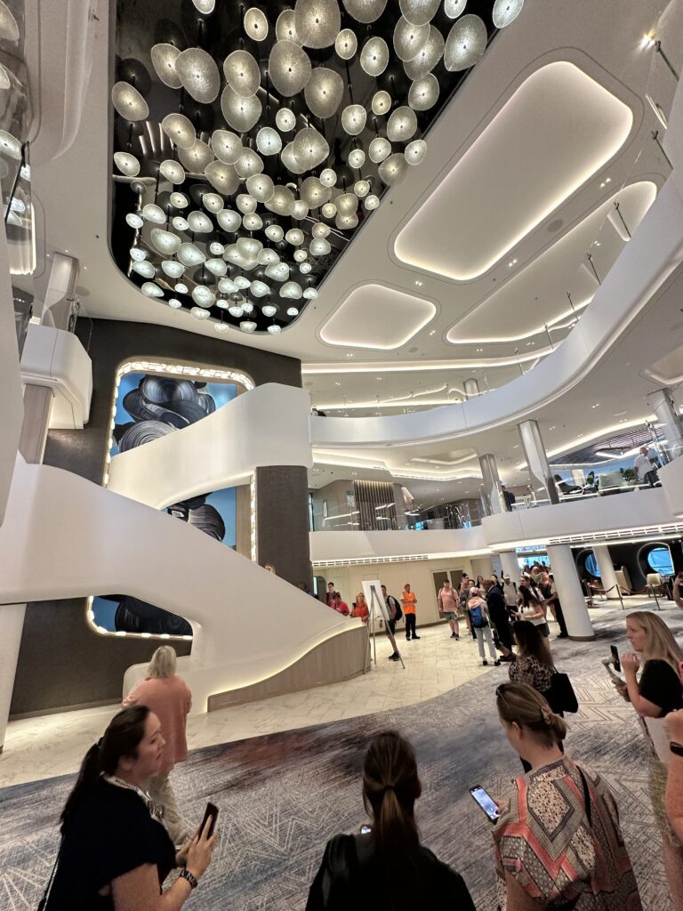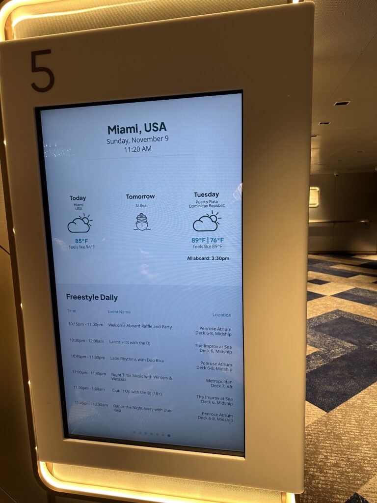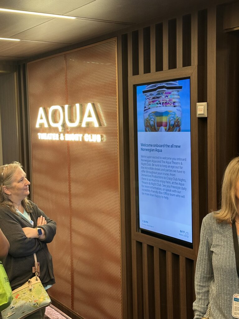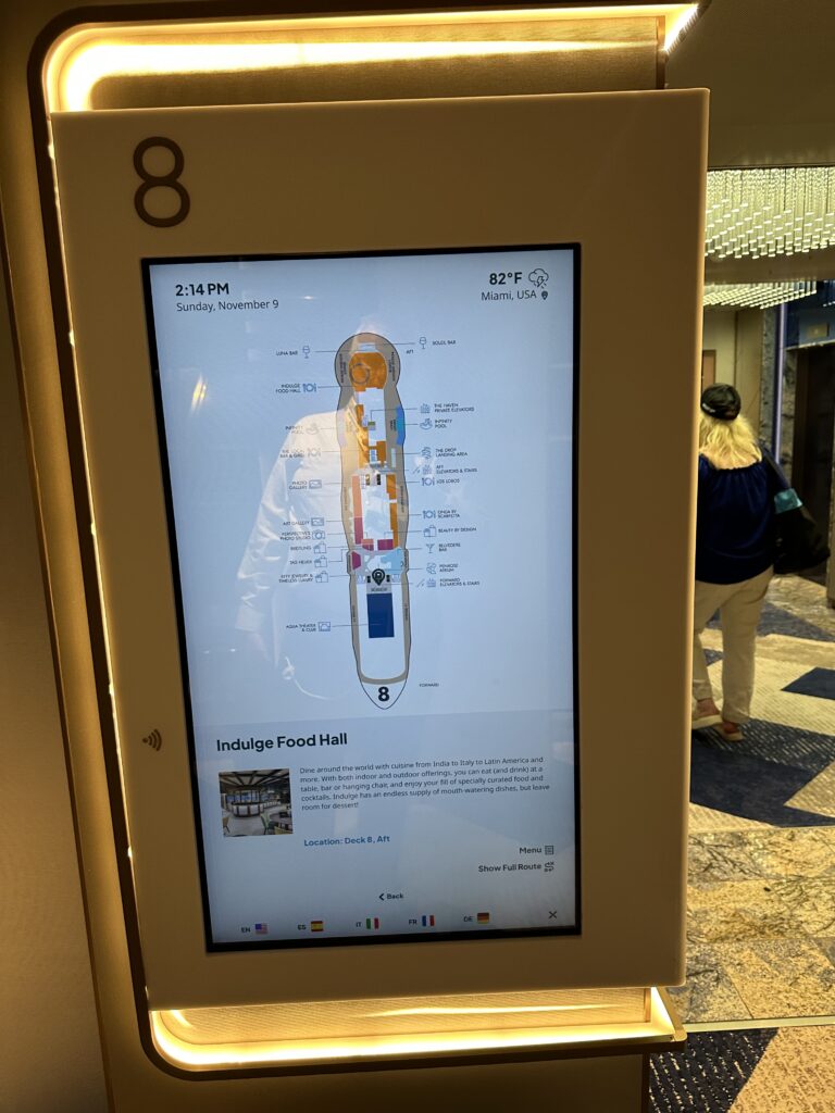 From the moment I stepped into Norwegian Aqua’s atrium, my first thought was, “This feels easy.” Wide, open spaces and clear sightlines make that first walk onto the ship feel more like entering a modern hotel lobby than a crowded cruise terminal. Around the elevator banks, the interactive screens became my digital concierge for the day—showing the weather, daily schedule, and a live map of the ship—so instead of hunting for venues, I could tap, plan, and just go. As I moved between decks, those same corridors and wayfinding displays reassured me that even first‑time cruisers and families will be able to get their bearings quickly, which makes the whole experience feel calmer and more enjoyable right from day one.