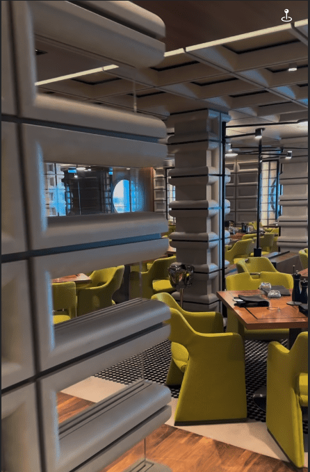 In the morning, I love starting the day in Hudson’s, where the light pours in and the space feels calm, elegant, and unhurried—it’s the kind of dining room where you linger over breakfast instead of rushing out the door. By lunchtime and into the afternoon, the energy shifts; around the ship you’ll find bright, modern venues with pops of color and a relaxed buzz, perfect for a casual meal, a coffee, or just people‑watching between activities.