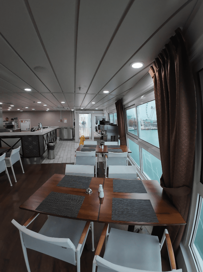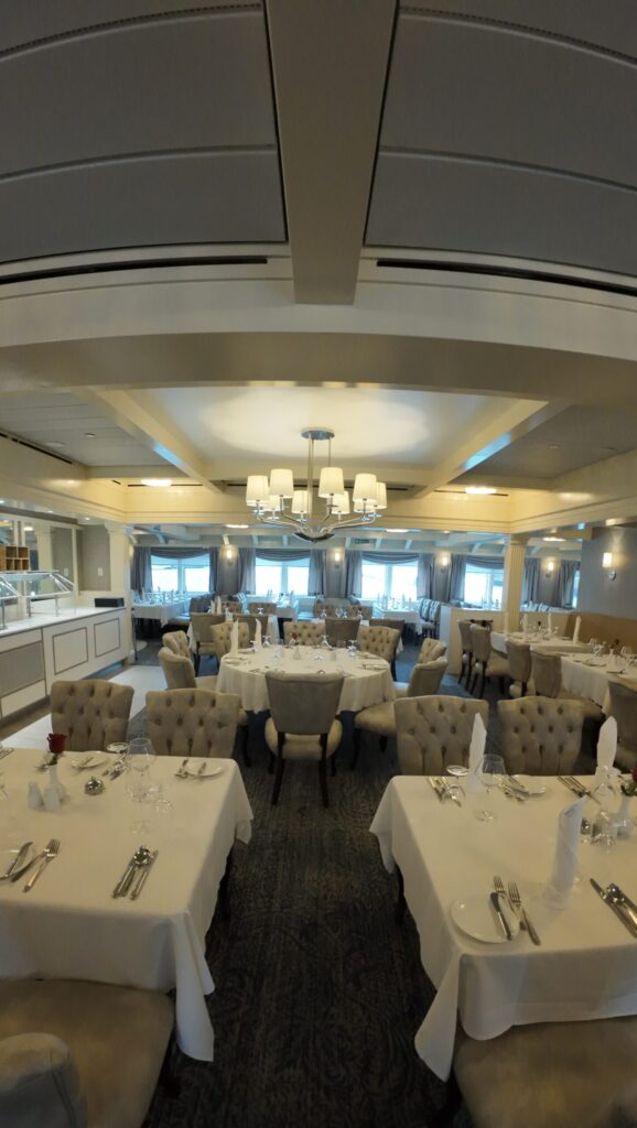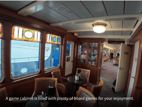 Just off the Compass Lounge, the Tavern offers a baby grand piano, classic board games, and plenty of corners where you can linger over a drink and good company. I imagined classmates sitting at the bar sharing college stories, or spreading out a board game at a small table while the lake views glide by just outside the large windows. Whether you are meeting old friends, striking up a conversation with fellow travelers, or simply watching the world drift quietly past, the Tavern always seems to carry an easy, welcoming buzz—the kind of place where time slips away in the best possible way.