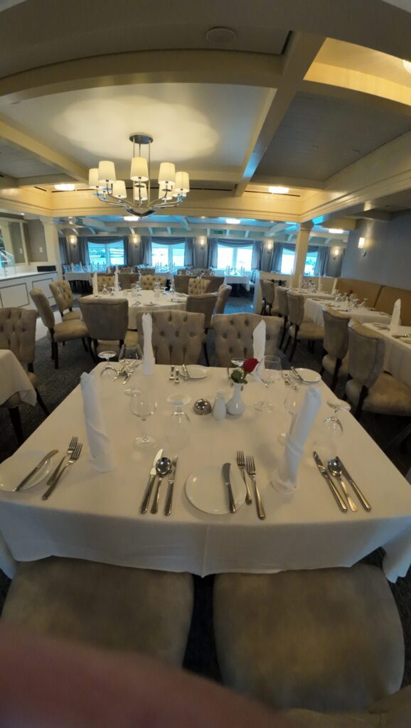 When I first walked into the Coastal Dining Room, what stood out to me was how it felt like a favorite neighborhood restaurant that just happens to float on the Great Lakes. Tables are set with crisp white linens, comfortable tufted chairs, and little touches—like a single red rose—that make the space feel refined yet relaxed. Beyond the windows, the views change with the route: city skylines, tree‑lined shores, and open stretches of water all become part of the backdrop to your meal.
