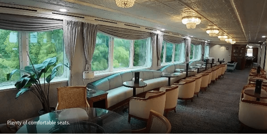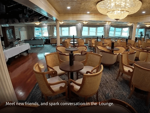 Throughout the cruise, the Compass Lounge transforms with the rhythm of the itinerary. During the day, it becomes a comfortable setting for enrichment talks and destination briefings, where you can learn more about the ports you will be exploring. In the evenings, the atmosphere shifts as live entertainment, cocktails, and easy conversation create a warm, social vibe—perfect for catching up with classmates from long ago or simply unwinding with a drink as the lake slips past outside.
